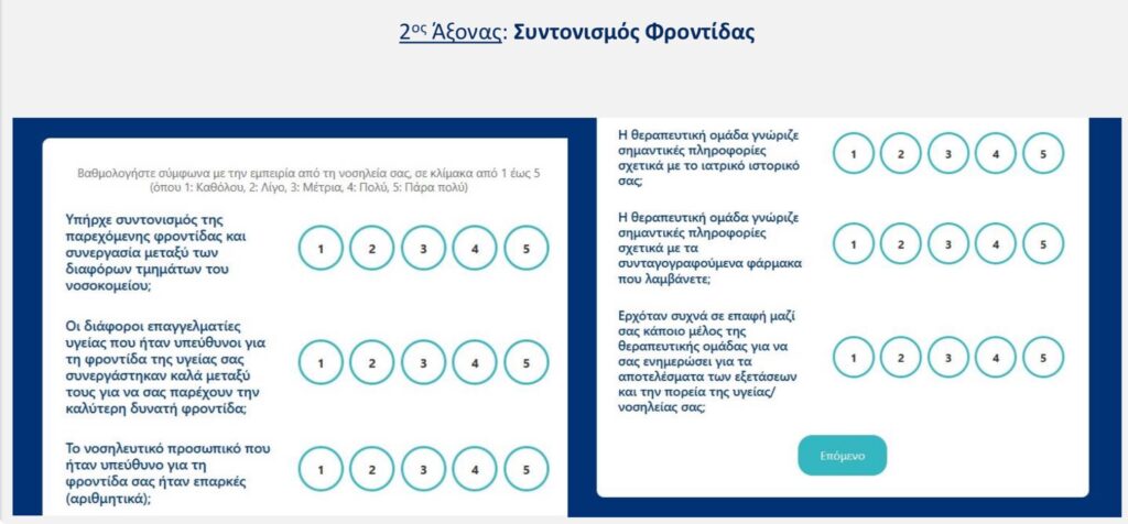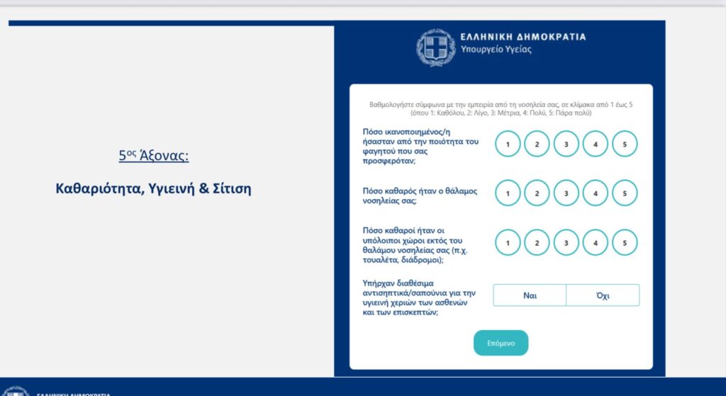 Στην ίδια ανάρτηση στο Facebook, ο κ. Σκέρτσος δημοσίευσε ένα από τα μηνύματα που έχουν σταλεί, καθώς και δύο ενδεικτικές καρτέλες του ερωτηματολογίου, που περιλαμβάνει κριτήρια όπως η ποιότητα των υπηρεσιών, η συμπεριφορά του προσωπικού και η γενική εμπειρία των ασθενών.