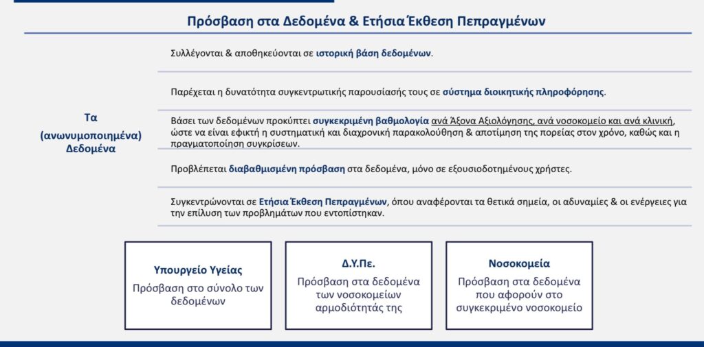Τα αποτελέσματα που θα συλλέγονται πλήρως ανωνυμοποιημένα θα συμβάλλουν στο να γίνονται στοχευμένες παρεμβάσεις σε όσες κλινικές και νοσοκομεία υστερούν, ενώ στο τέλος κάθε έτους θα συντάσσεται έκθεση απολογισμού με κωδικοποιημένα τα συμπεράσματα, τη βαθμολογία κάθε νοσοκομείου και τις προτεινόμενες παρεμβάσεις για να γίνεται καλύτερο.
