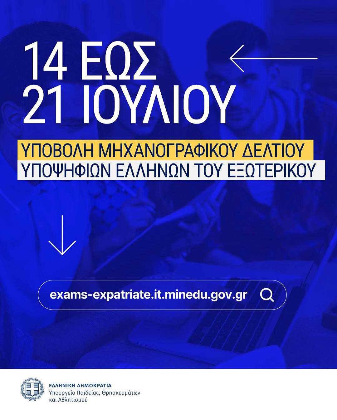 Το Υπουργείο Παιδείας, Θρησκευμάτων και Αθλητισμού, ανακοινώνει την υποβολή ηλεκτρονικής αίτησης συμμετοχής στις εξετάσεις και του μηχανογραφικού δελτίου για την εισαγωγή Ελλήνων του εξωτερικού στην Τριτοβάθμια Εκπαίδευση έτους 2025 από Δευτέρα 14 έως Δευτέρα 21 Ιουλίου 2025.