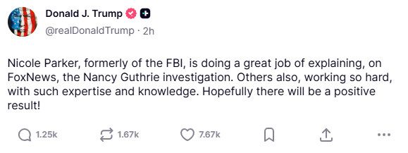 Η 84χρονη Νάνσι Γκάθρι απήχθη τη νύχτα της 31ης Ιανουαρίου προς την 1η Φεβρουαρίου από την κατοικία της στο Τουσόν της Αριζόνα. Η μυστηριώδης εξαφάνισή της έχει προκαλέσει έντονο ενδιαφέρον στα αμερικανικά μέσα ενημέρωσης, ενώ ο ίδιος ο πρόεδρος των ΗΠΑ Ντόναλντ Τραμπ, δήλωσε μέσω του Truth Social ότι παρακολουθεί στενά τις εξελίξεις, εκφράζοντας την ελπίδα για μια «θετική κατάληξη».