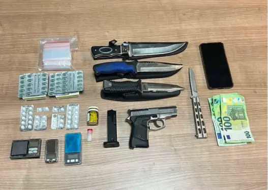 Κατά τη διάρκεια των ερευνών, οι αρχές ήρθαν αντιμέτωπες με ευρήματα που παραπέμπουν σε οργανωμένη εμπορία. Συνολικά κατασχέθηκαν 119 ναρκωτικά χάπια, η προέλευση και η σύνθεση των οποίων εξετάζονται, ενώ ιδιαίτερη σημασία δίνεται στον εντοπισμό τριών ζυγαριών ακριβείας, εργαλεία απαραίτητα για τη μεριδοποίηση των ουσιών. Εκτός από το εμπόρευμα, στο σπίτι του 43χρονου βρέθηκε ένα πιστόλι με γεμιστήρα, το οποίο κατασχέθηκε και θα αποσταλεί για εργαστηριακή εξέταση ώστε να διαπιστωθεί εάν έχει χρησιμοποιηθεί σε άλλες εγκληματικές ενέργειες. Παράλληλα, οι αστυνομικοί εντόπισαν το χρηματικό ποσό των 300 ευρώ, ένα κινητό τηλέφωνο που θεωρείται κομβικής σημασίας για την αποκάλυψη των επαφών του, καθώς και πλήθος πλαστικών συσκευασιών που χρησιμοποιούνταν για τη συσκευασία των δόσεων.