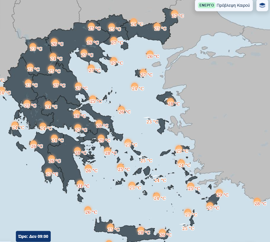 Σύμφωνα με την πρόγνωση της ΕΜΥ, η θερμοκρασία θα φτάσει στα ηπειρωτικά τους 36 με 37 και κατά τόπους στην ανατολική Στερεά και την ανατολική Πελοπόννησο τους 38 βαθμούς, στο Ιόνιο τους 34 βαθμούς, στα νησιά του Ανατολικού Αιγαίου, τα Δωδεκάνησα και την νότια Κρήτη τους 35 με 36 βαθμούς και στην υπόλοιπη νησιωτική χώρα τους 31 με 32 βαθμούς Κελσίου.: Από 23 έως 37 με 38 βαθμούς Κελσίου στην Αττική και από 20 έως 36 βαθμούς Κελσίου στη Θεσσαλονίκη.