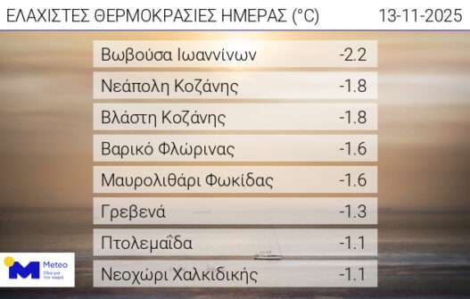 Η Βωβούσα, χωριό της Πίνδου, κατέγραψε την χαμηλότερη θερμοκρασία της ημέρας, με τον μετεωρολογικό σταθμό να δείχνει -2.2˚C, τιμή που επιβεβαιώνει την έντονη ψύχρα στις ορεινές περιοχές.