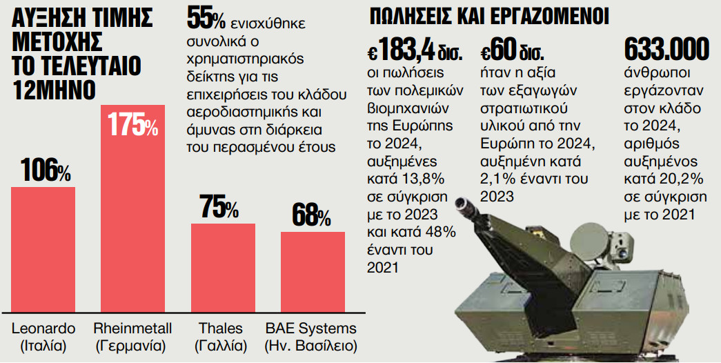 Είναι κάτι, άλλωστε, που αναδεικνύεται και από τις επιδόσεις που κατέγραψαν το τελευταίο 12μηνο οι μετοχές ορισμένων εκ των πιο ισχυρών εξ αυτών στα χρηματιστήρια, καθώς σε αρκετές περιπτώσεις – όπως της γερμανικής Rheinmetall και της ιταλικής Leonardo – η τιμή τους υπερδιπλασιάστηκε. Παράλληλα, ο δείκτης που αφορά το σύνολο των εισηγμένων επιχειρήσεων του κλάδου της αεροδιαστημικής και των εξοπλισμών ενισχύθηκε στη διάρκεια του προηγούμενου έτους κατά 55%, ενώ άλμα παρουσιάζουν επίσης τόσο οι πωλήσεις τους όσο και ο αριθμός των εργαζομένων σε αυτές.
