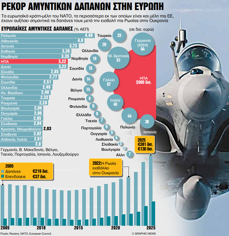 Δεν είναι τυχαίο, λοιπόν, ότι η πρόεδρος της Κομισιόν αφιέρωσε σημαντικό μέρος της παρέμβασής της στην προσπάθεια να πείσει τους παρευρισκόμενους και εκείνους που την άκουγαν εξ αποστάσεως ότι η Ευρώπη έχει αλλάξει ταχύτητα και στα δύο αυτά επίπεδα. Ειδικά δε στο δεύτερο, τα στοιχεία έρχονται να επιβεβαιώσουν τους ισχυρισμούς της Φον ντερ Λάιεν, καθώς τα 27 κράτη – μέλη της ΕΕ διέθεσαν πέρυσι για τις στρατιωτικές – αμυντικές, σύμφωνα με την επίσημη ορολογία – δαπάνες τους (λειτουργικό κόστος, εξοπλισμούς, επενδύσεις σε υποδομές κ.λπ.) το συνολικό ποσό – ρεκόρ των 511 δισ. ευρώ. Ενα ποσό, δηλαδή, αυξημένο κατά 13,5% σε σύγκριση με το 2024 και διπλάσιο έναντι του αντίστοιχου πριν από μία πενταετία (2021).