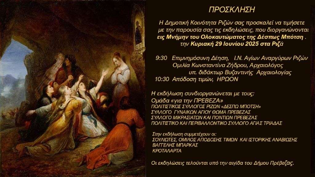 Την Κυριακή 29 Ιουνίου θα πραγματοποιηθεί στα Ριζά Πρέβεζας, εκδήλωση μνήμης και τιμής για το ολοκαύτωμα της Δέσπως Μπότση και της οικογένειάς της.