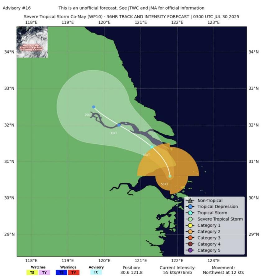 Η καταιγίδα Co-May έφθασε στην ξηρά στην πόλη-λιμάνι Ζουσάν, στην επαρχία Τσετσιάνγκ νωρίς σήμερα το πρωί (τοπική ώρα). Σύντομα ακολούθησαν προειδοποιήσεις για τσουνάμι λόγω ενός ισχυρού σεισμού ανοικτά της ρωσικής Άπω Ανατολής, προκαλώντας ανησυχία για μεγαλύτερα του αναμενομένου κύματα καταιγίδας κατά μήκος των κινεζικών ακτών.
