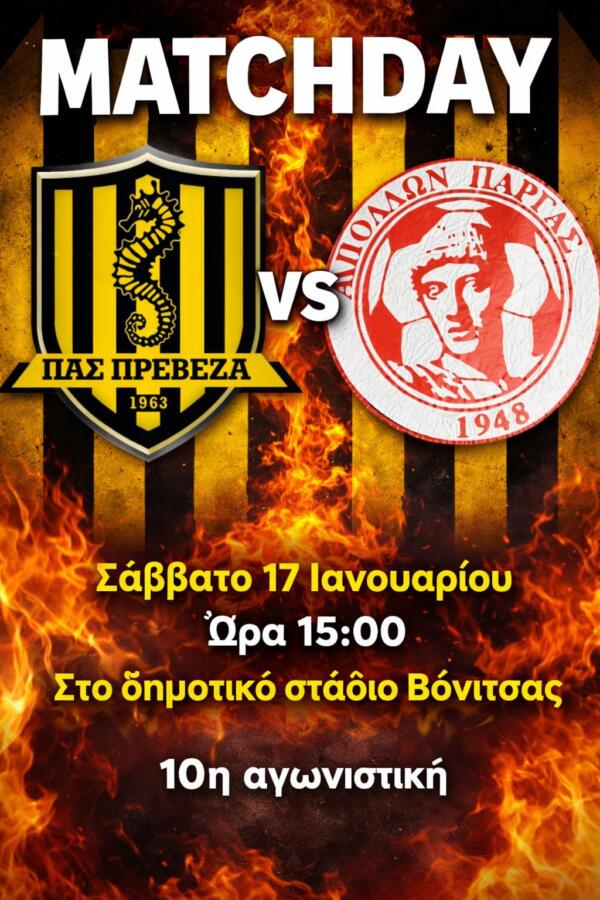 Η αντίστροφη μέτρηση για την επανέναρξη των αγωνιστικών υποχρεώσεων στην Α’ Κατηγορία ΕΠΣ Πρέβεζας – Λευκάδας έχει ήδη ξεκινήσει, με τον ΠΑΣ Πρέβεζα να στρέφει όλη του την προσοχή στη μεγάλη αναμέτρηση του Σαββάτου. Η ομάδα μπαίνει στη μάχη του δεύτερου γύρου με την ψυχολογία στα ύψη, έχοντας ως μοναδικό και αδιαπραγμάτευτο στόχο τη διατήρηση της πρώτης θέσης στον βαθμολογικό πίνακα. Η συνάντηση με τον Απόλλωνα Πάργας έχει οριστεί για τις 17 Ιανουαρίου στις 15:00, με το Δημοτικό Γήπεδο της Βόνιτσας να αποτελεί το σκηνικό όπου οι «κιτρινόμαυροι» θα επιδιώξουν να επιβεβαιώσουν για ακόμα μια φορά τον τίτλο του φαβορί για την κατάκτηση του φετινού πρωταθλήματος.