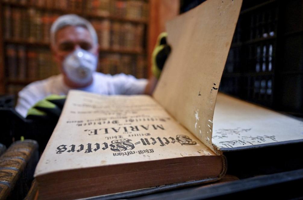 Συντηρητές αφαιρούν περίπου 100.000 χειροποίητα βιβλία από τα ράφια τους και τα τοποθετούν προσεκτικά σε κιβώτια. Πρόκειται για μια διαδικασίας απολύμανσης με στόχο την εξόντωση των μικροσκοπικών σκαθαριών που έχουν τρυπώσει μέσα τους.