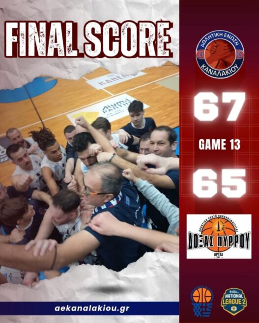 Σε ένα παιχνίδι που κράτησε αμείωτο το ενδιαφέρον των φιλάθλων μέχρι το τελευταίο δευτερόλεπτο, η Α.Ε. Καναλακίου κατάφερε να κάμψει την αντίσταση της Δόξας Πύρρου Άρτας, παίρνοντας το πολύτιμο ροζ φύλλο αγώνα με σκορ 67-65. Η αναμέτρηση, που διεξήχθη την Κυριακή 11 Ιανουαρίου 2026 για την 13η αγωνιστική της National League 2, εξελίχθηκε σε ένα πραγματικό ντέρμπι χαρακτήρα και τακτικής, με τις δύο ομάδες να εναλλάσσονται στο προβάδισμα και την ένταση να χτυπάει κόκκινο στο παρκέ του Καναλακίου.
